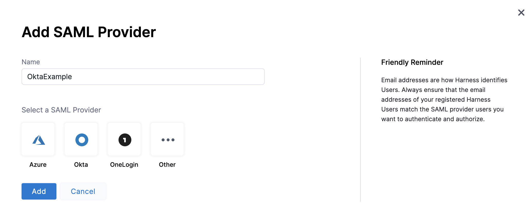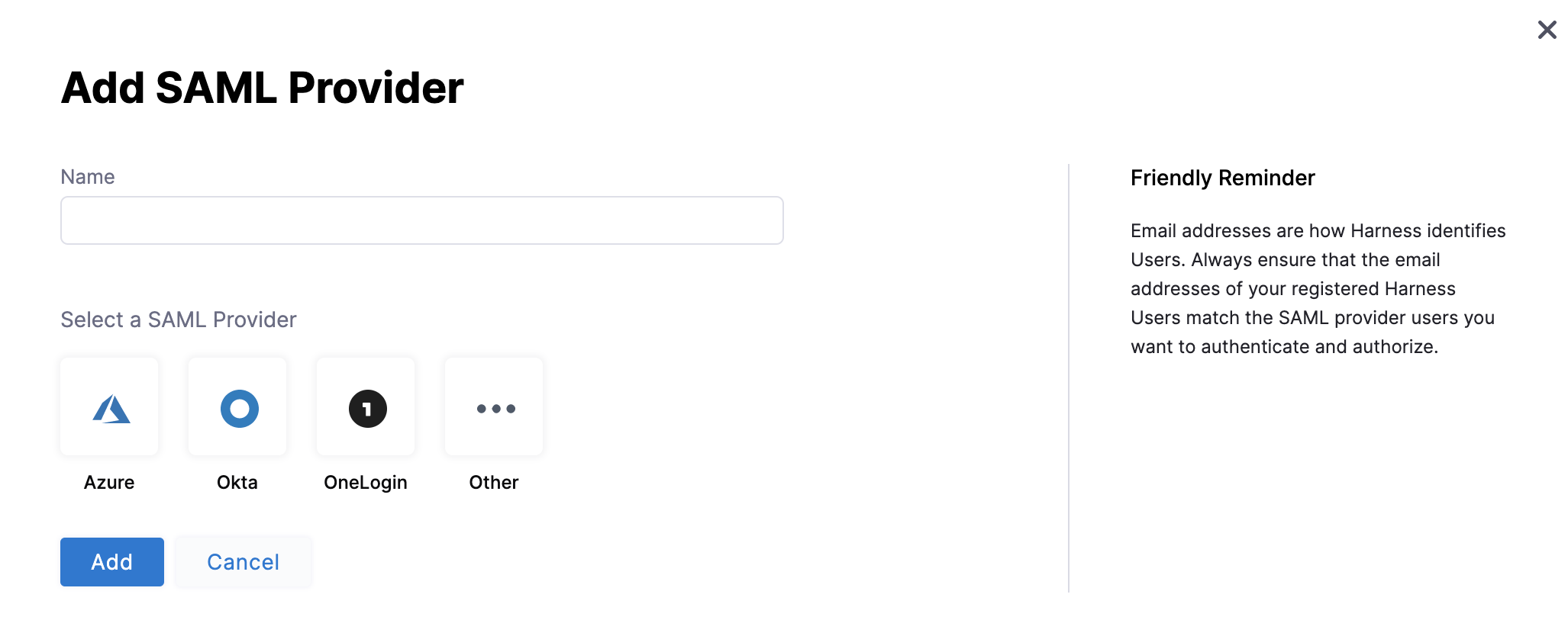 • SAML provider user email addresses: To use the SAML provider to verify Harness Users, the email addresses used in the SAML provider must match the email addresses for the registered Harness Users you want to verify.