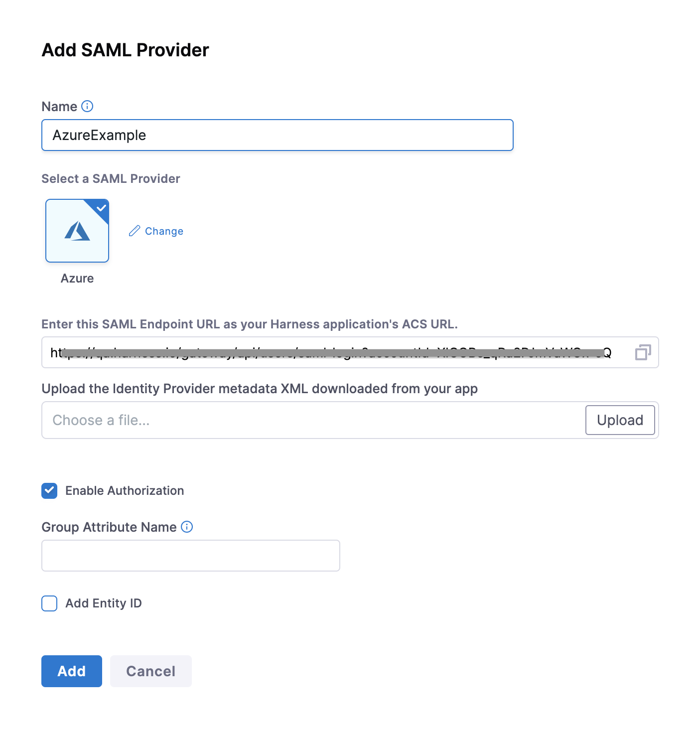 3. In Harness, on the Add SAML Provider page, in Upload the Identity Provider metadata XML downloaded from your Okta app, select Choose a file or Upload, and select the SAML metadata file you downloaded from your Okta app.