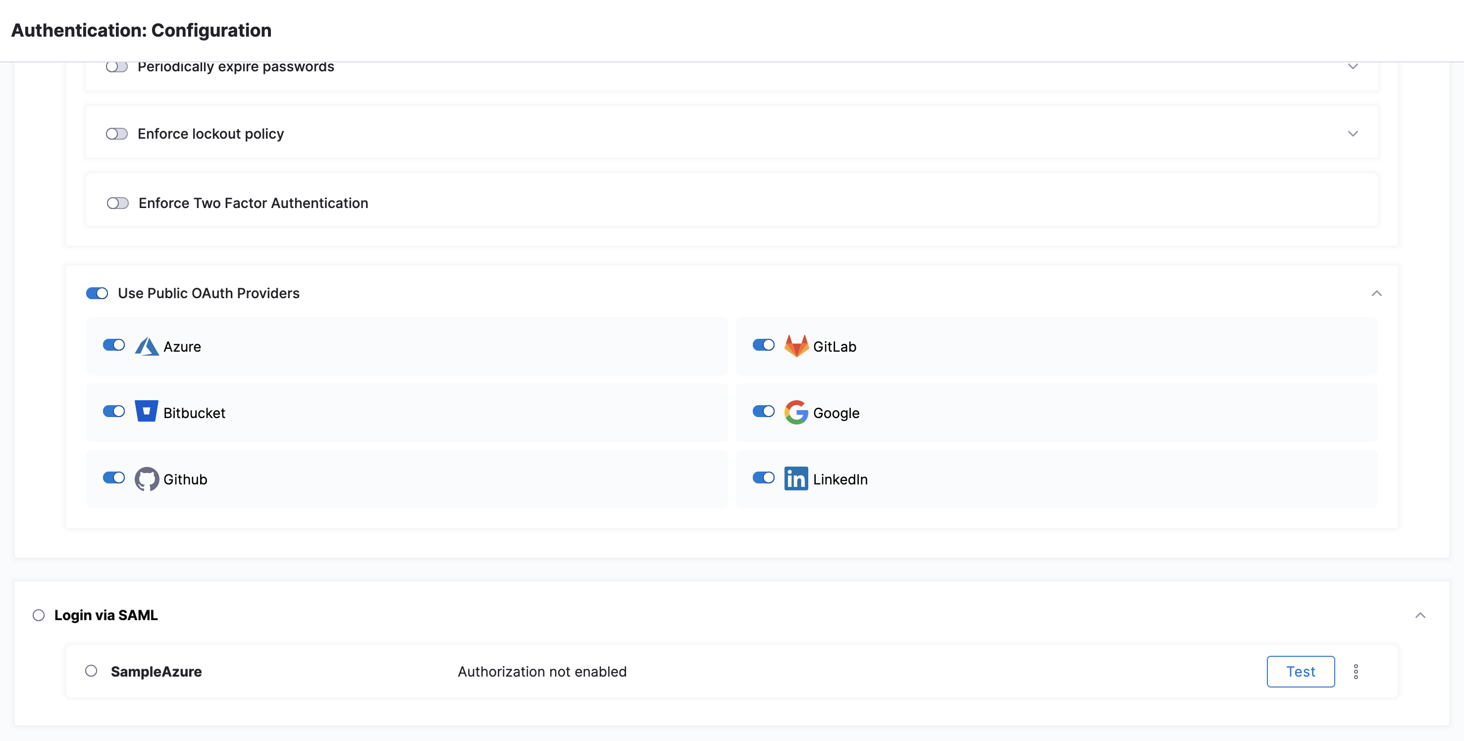 To prevent lockouts or in the event of OAuth downtime, a user that has Account Admin assigned on All Account Level Resources or All Resources Including Child Scopes can use the Local login URL https://app.harness.io/auth/#/local-login to sign in and update the OAuth settings.