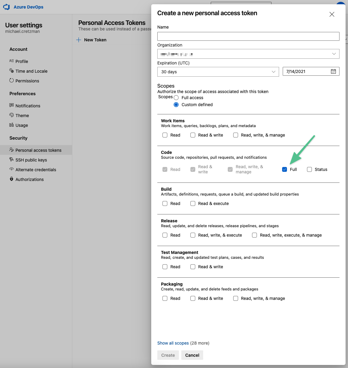 • Supported Methods: username and Personal Access Token (PAT). For information on creating PAT in GitHub, see Creating a personal access token.