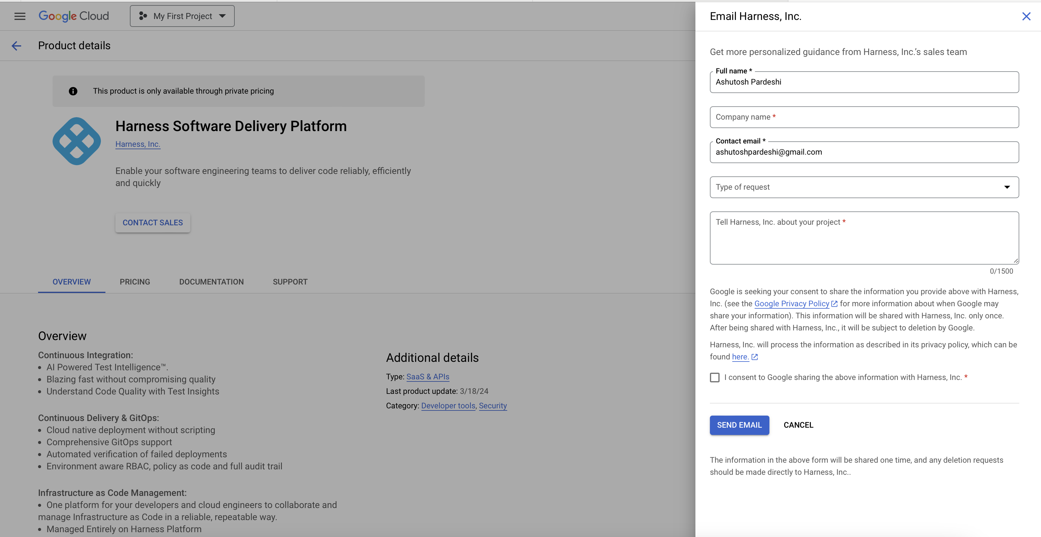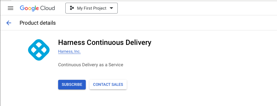• If don't have an existing relationship with Harness and you're interested in a Harness product, you can request a custom quote for it. To contact Harness' sales team, select Contact Sales in the Google Cloud Marketplace.