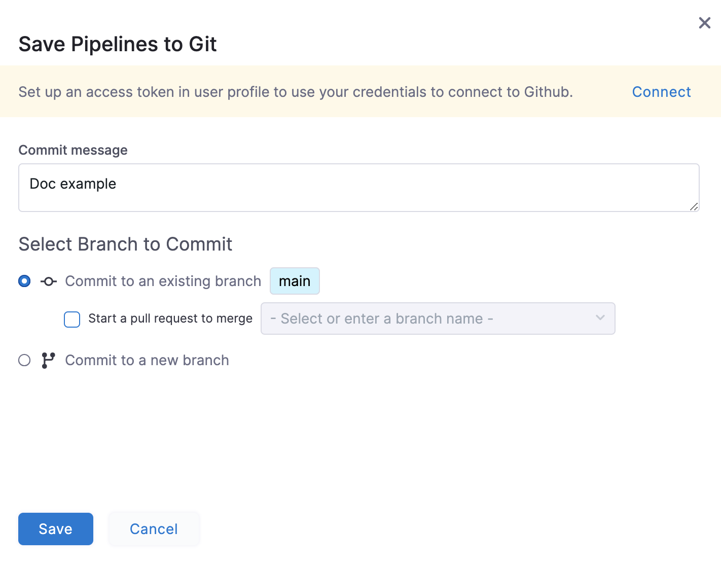 • Select Connect to configure OAuth for Git and use your Git credentials for the commit, and then select Save. This is optional.