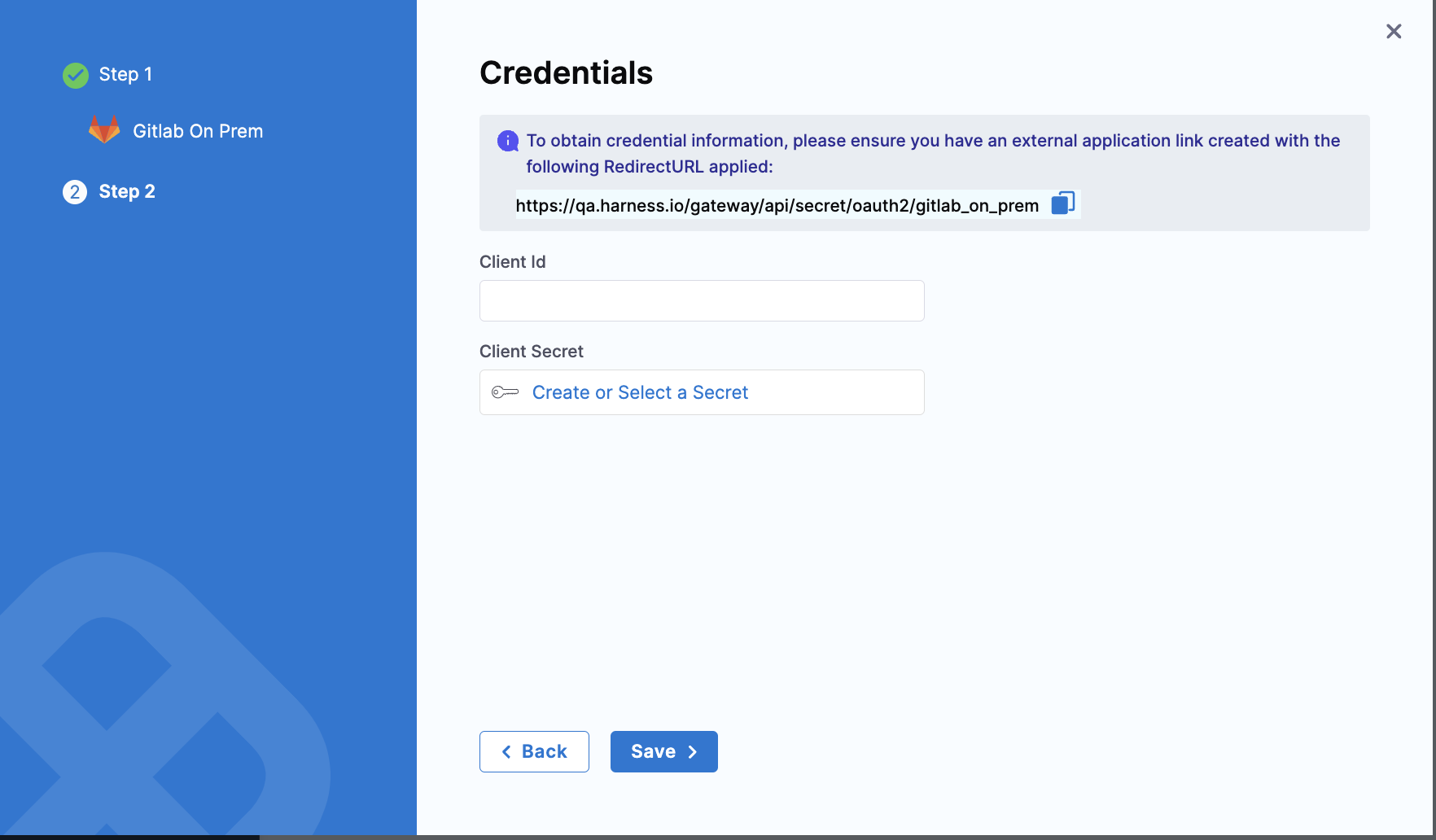 1. Copy the Redirect URL provided on the Harness Credentials page.