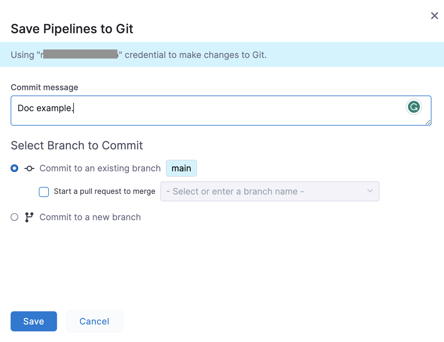 • Select Save to use the credentials from the Git connector for the commit.