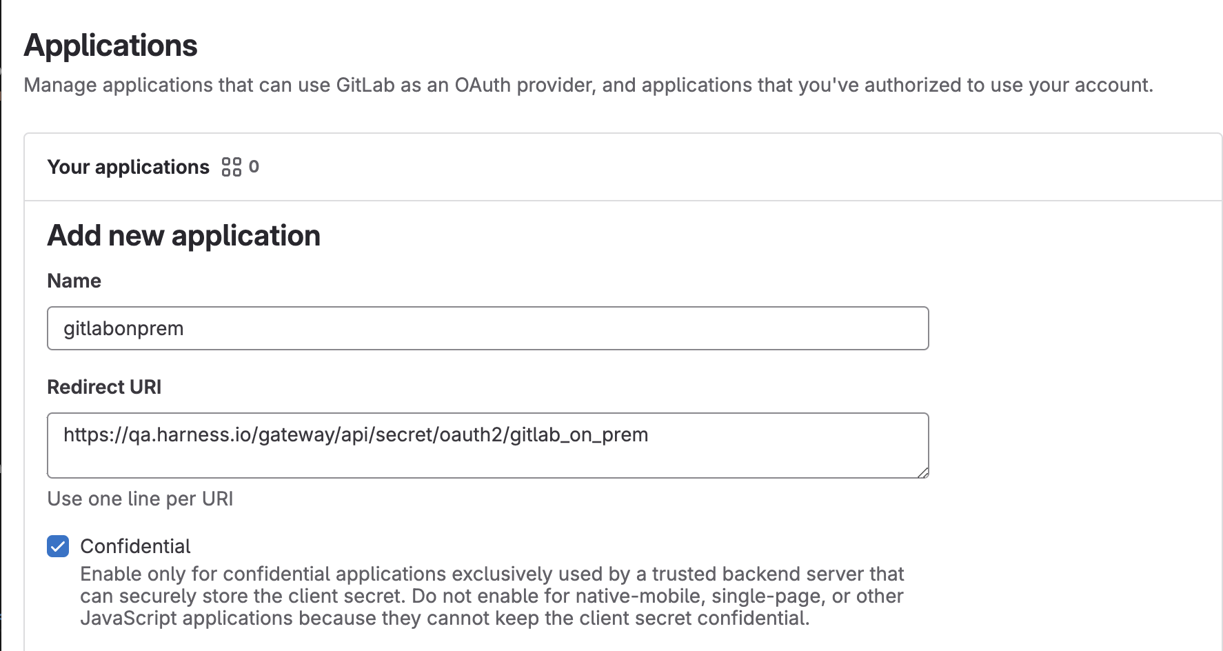 Currently, support for OAuth configuration with the self-hosted and onprem Gitlab provider is behind the feature flag CDS_PROVIDERS and PIPE_ENABLE_GITLAB_ON_PREM_FLOW . Please contact Harness support to enable this feature.