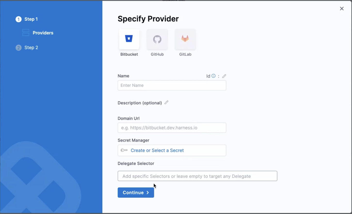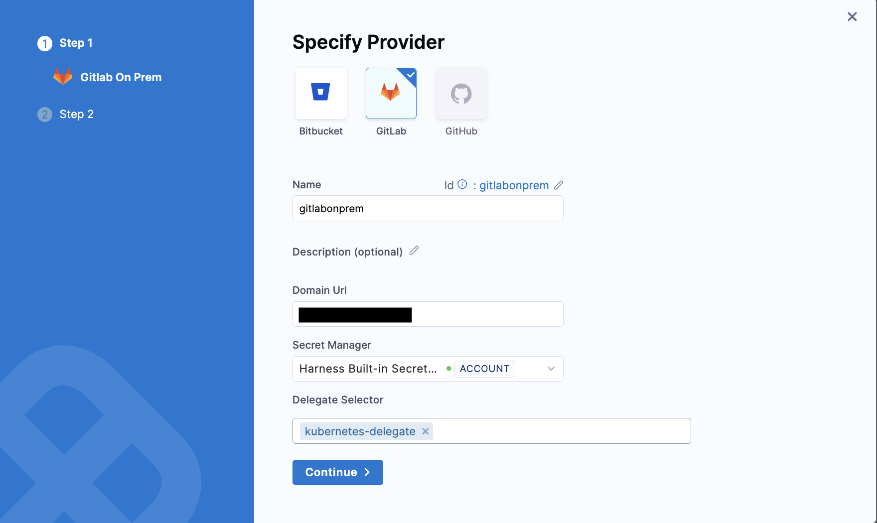 4. Specify the Delegate Selector. Click on continue.