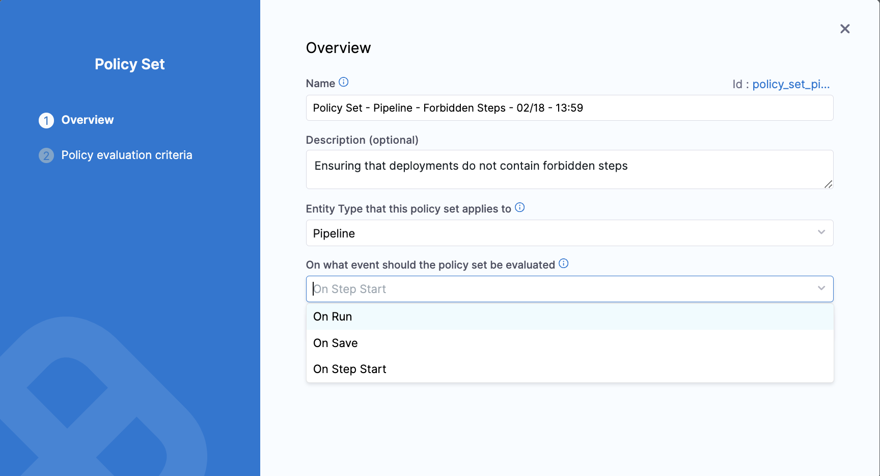 - On Save: Policies are evaluated when the Pipeline is saved.