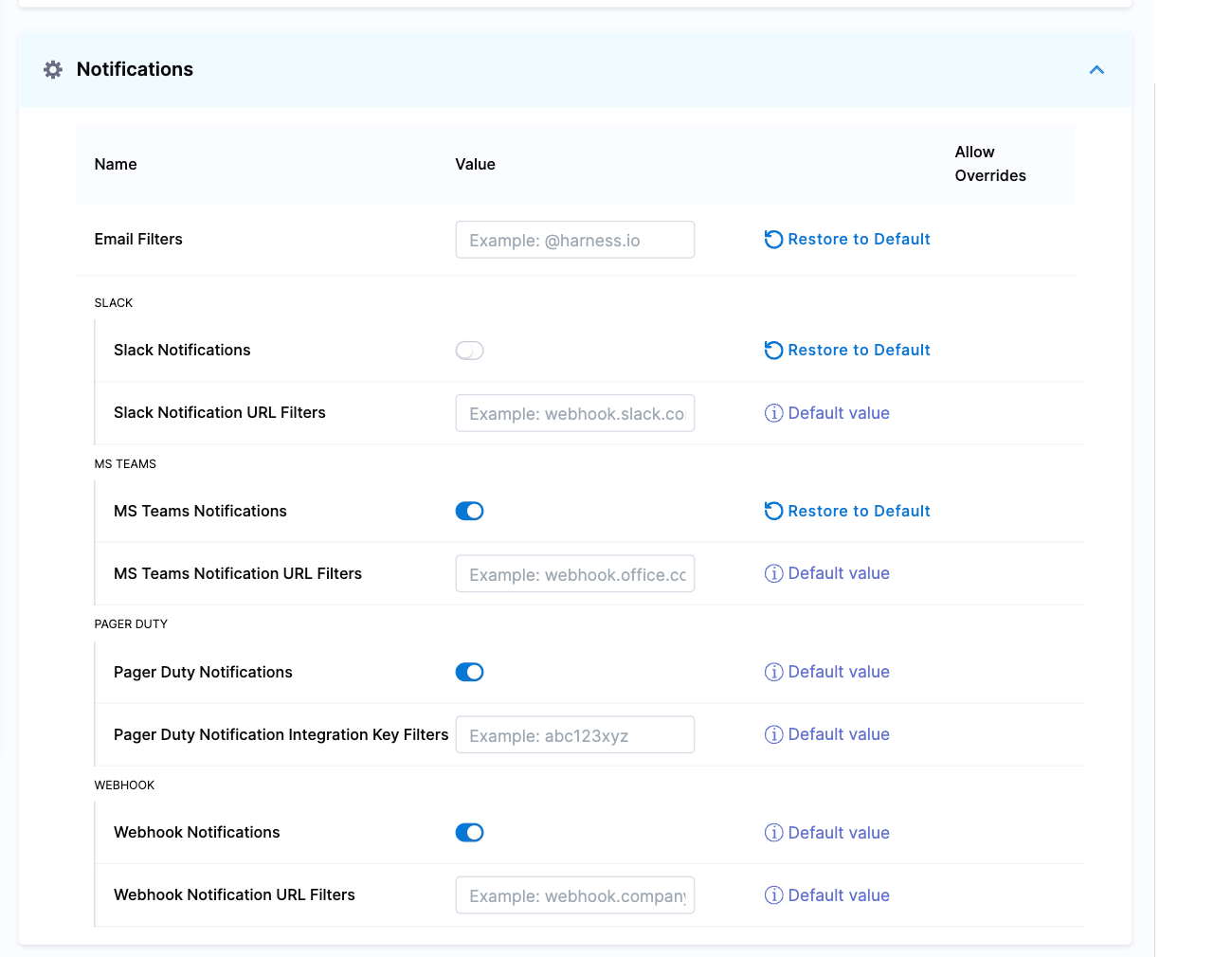 With notification settings, you can enable or disable notification channels at an account level. By default, all notification channels are enabled on an account. Organizations and projects in the account inherit the account-level settings.
