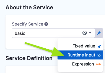In the Pipeline Studio's Visual Editor, you can use the Value type selector to select Runtime Input.