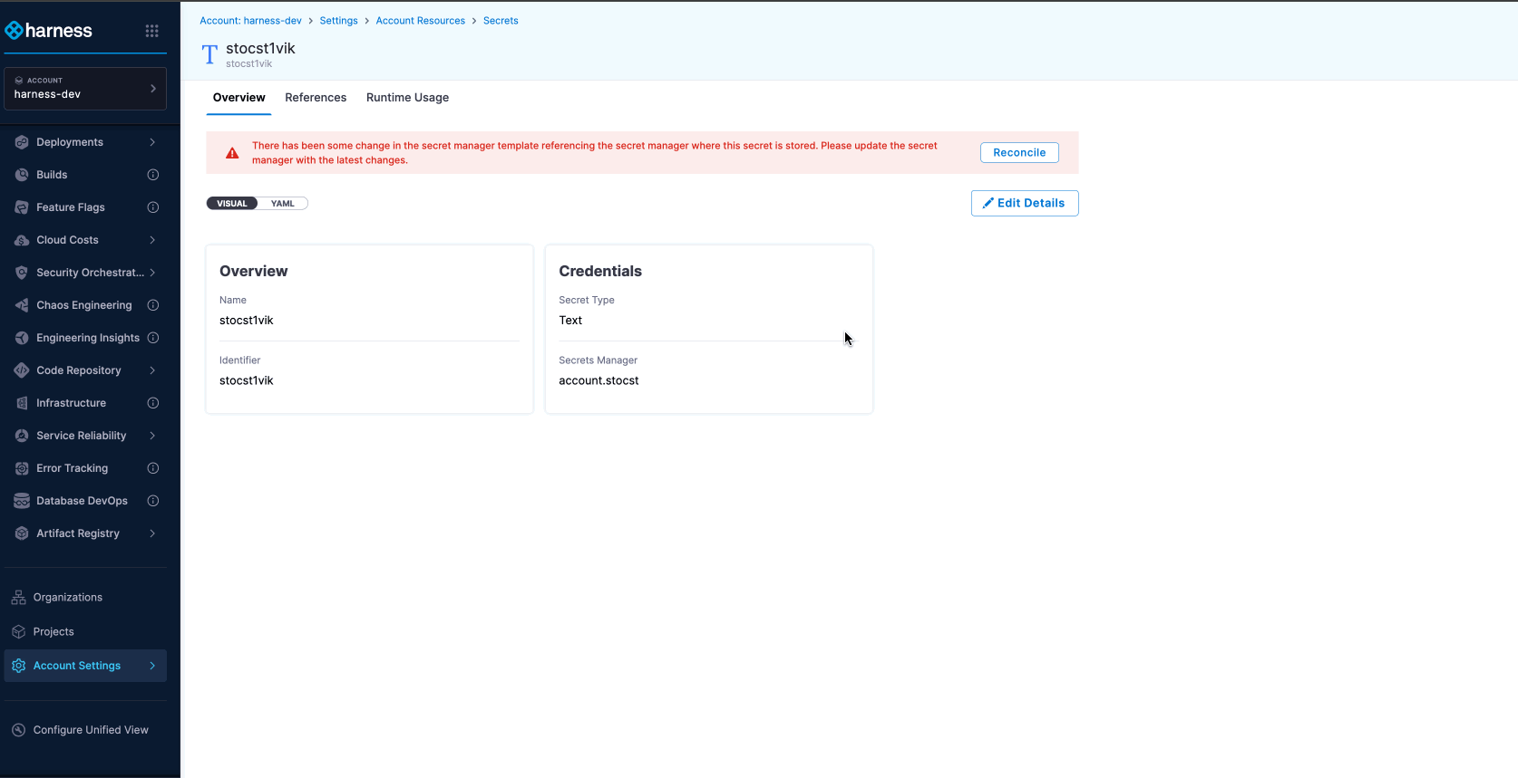 After saving the template changes, Harness automatically identifies all dependent Custom Secret Managers and Secrets that need to be updated. Reconciliation alerts will appear on these entities to guide you through the update process.