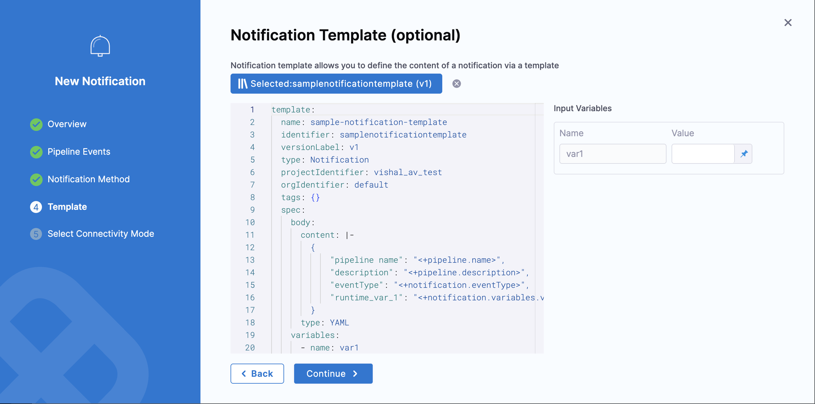 Use the following expression format to reference these variables in your template body: <+notification.variables.testVar>