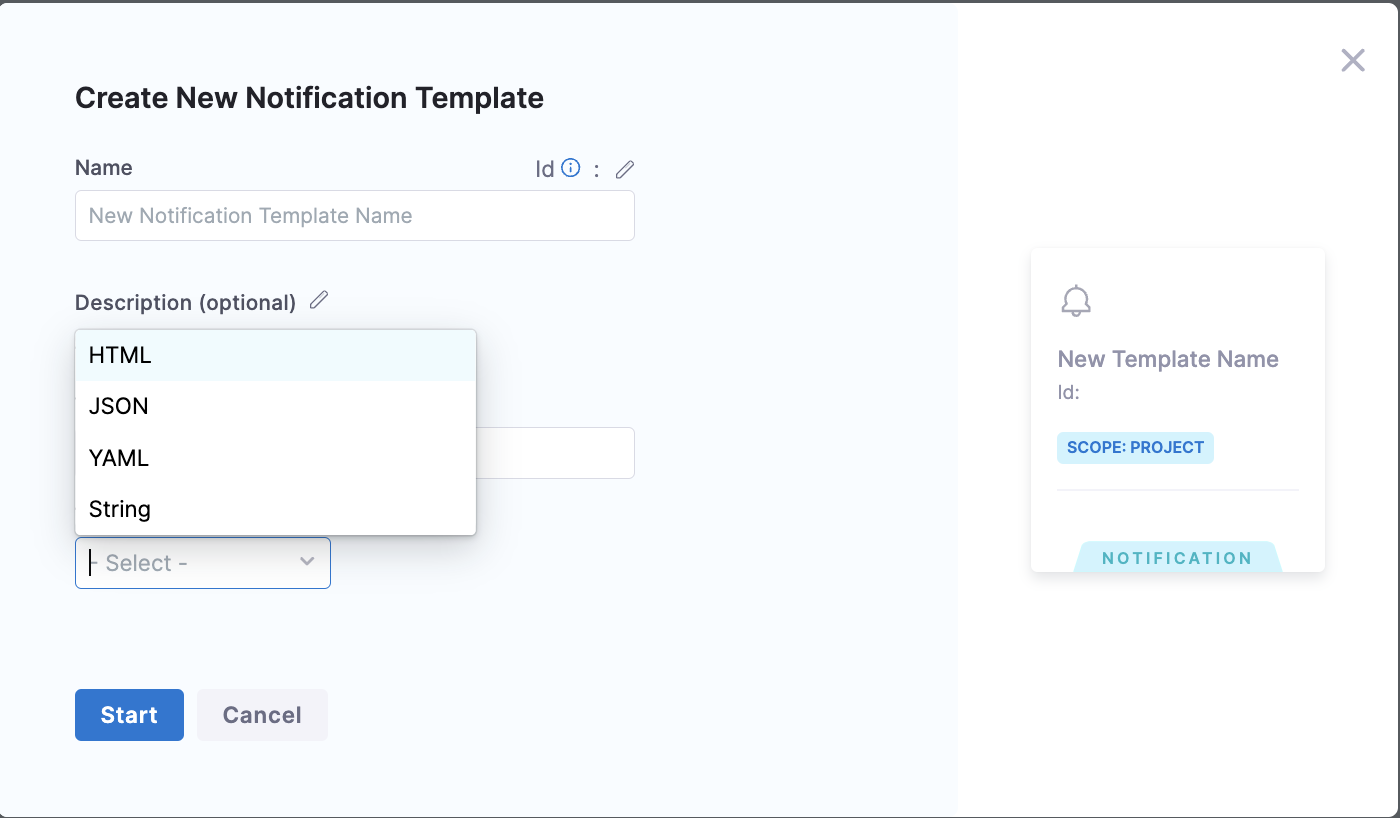 . Versioning a template enables you to create a new template without modifying the existing one. For more information, go to Versioning. - In Text Type you can choose text type as HTML, JSON, YAML or String for content body based on what notification method you are using.