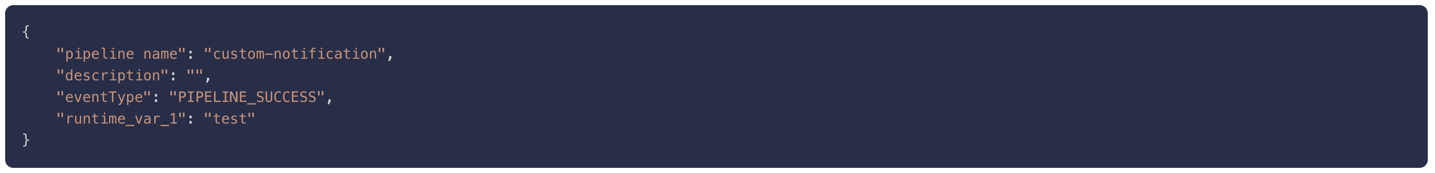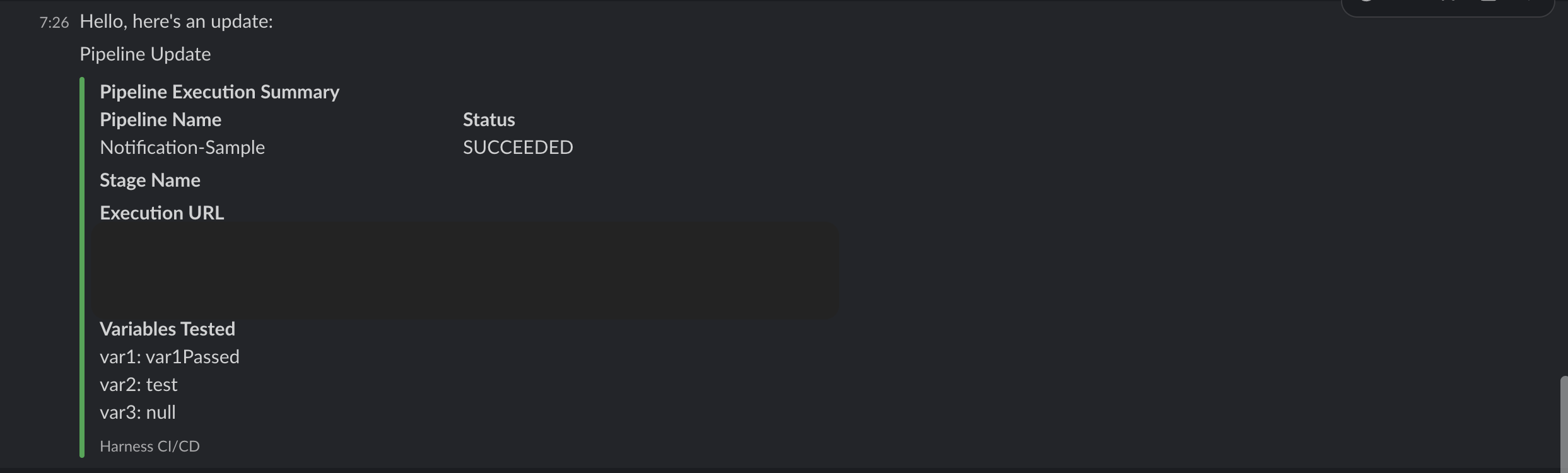 "text": "Pipeline **<+pipeline.name>** has **<+notification.eventType>**.\n\n• **Project:** `<+project.identifier>`\n• **Org:** `<+org.identifier>`\n• **Execution URL:** `<+pipeline.executionUrl>`\n• **Detail 1:** `<+notification.variables.var1>`\n• **Detail 2:** `<+notification.variables.var2>``\n• **Detail 3:** `<+notification.variables.var3>",