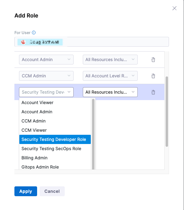 4. Assign the Security Testing Developer role or the Security Testing AppSec role to the user profile.