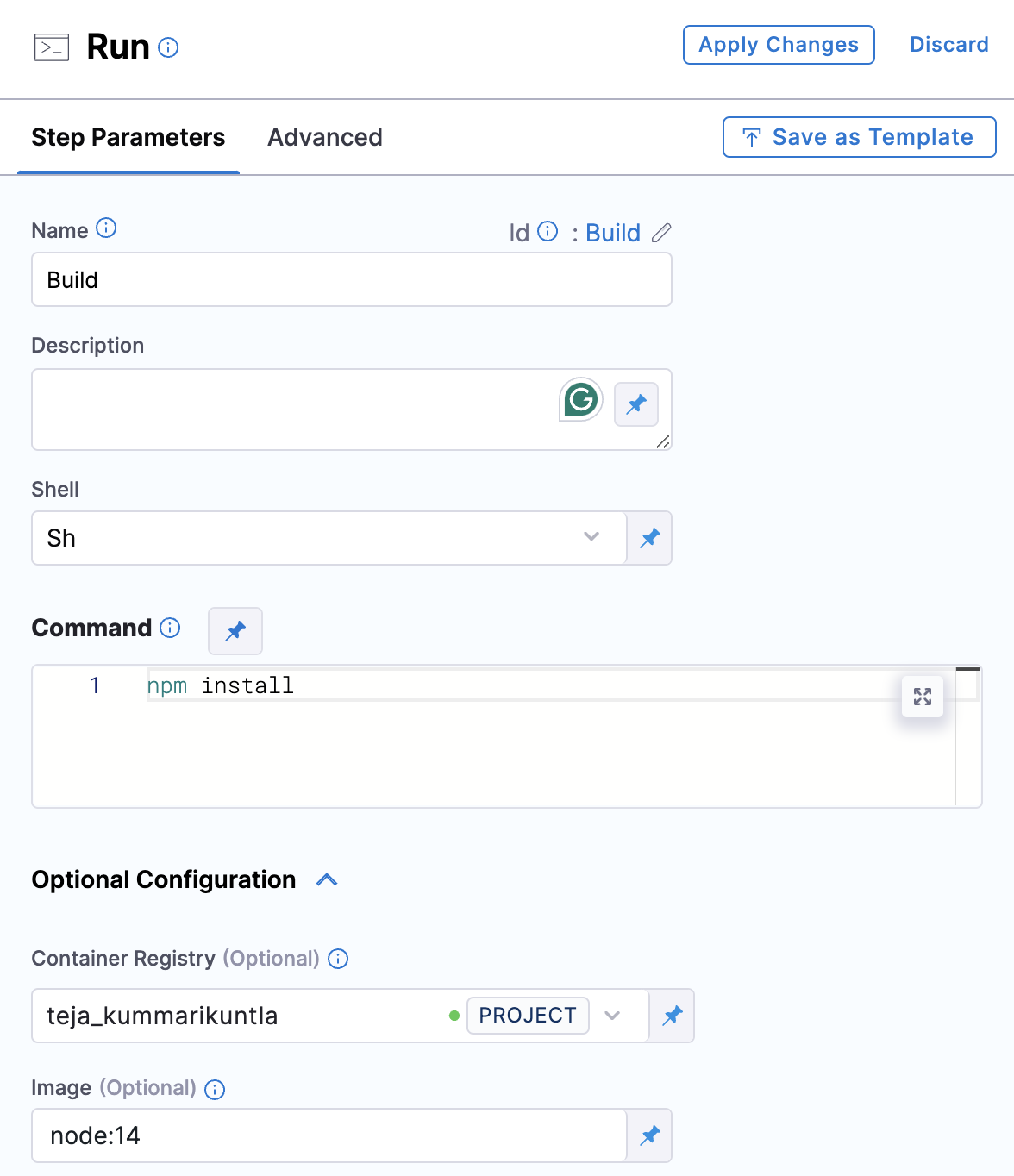 for JavaScript projects. - Under Optional Configuration, configure your container registry and the image that facilitates your project build.