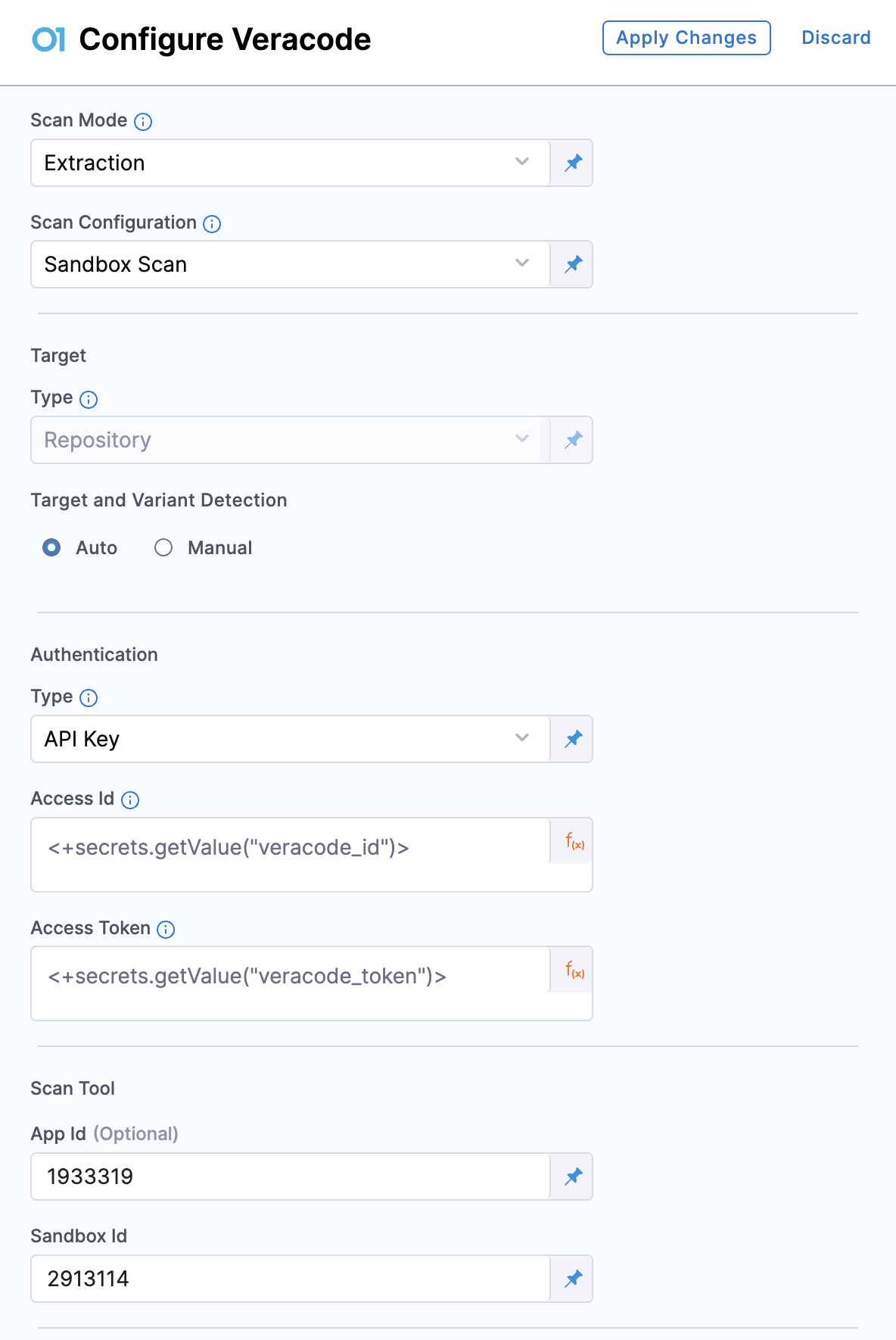 The Extraction mode in Veracode step allows you to retrieve the latest scan data of a specific Veracode Application and feed the results into STO. Here's how you can do it.
