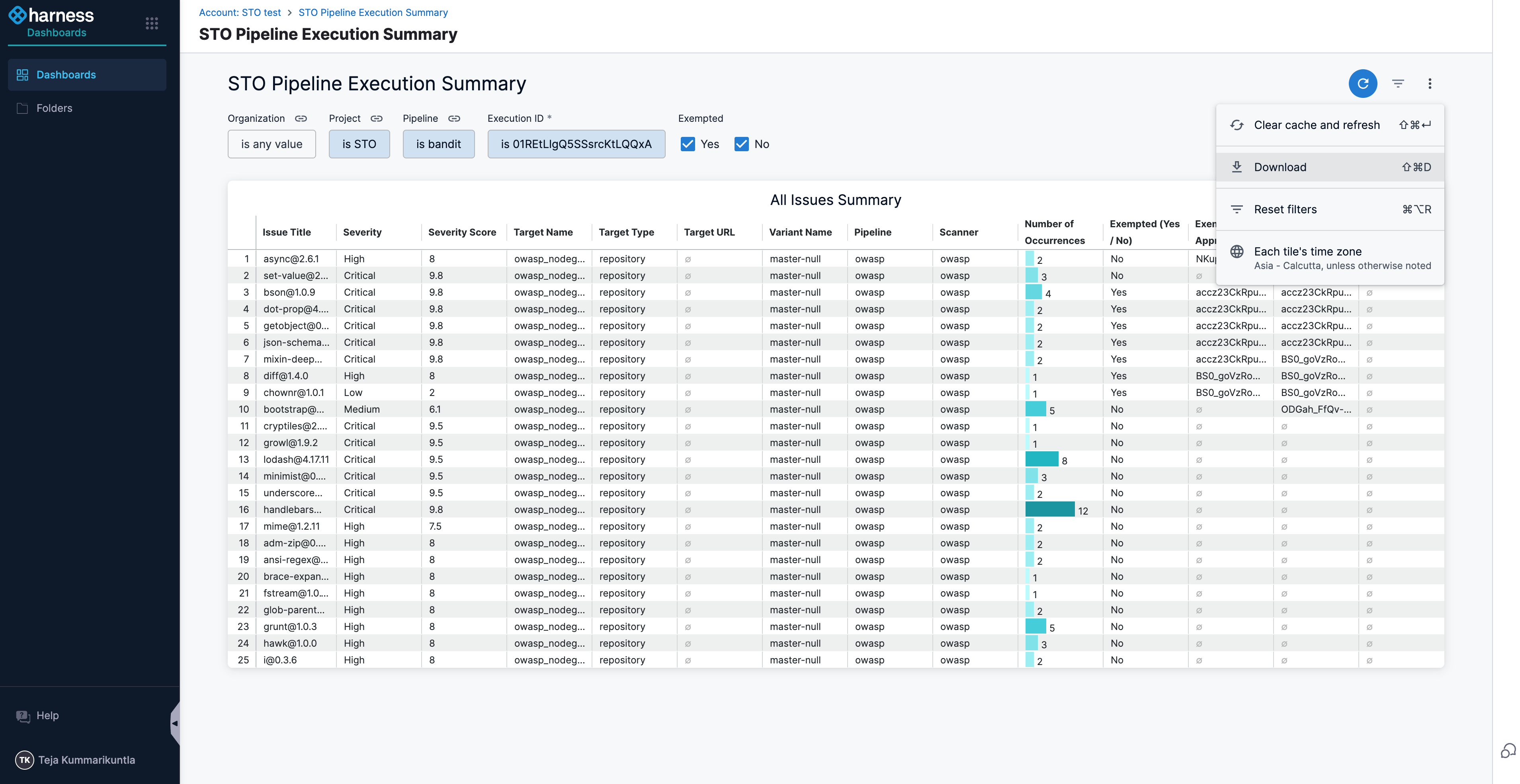 - Direct export from Dashboard: Manually download scan results from the STO Pipeline Execution Summary Dashboard UI.