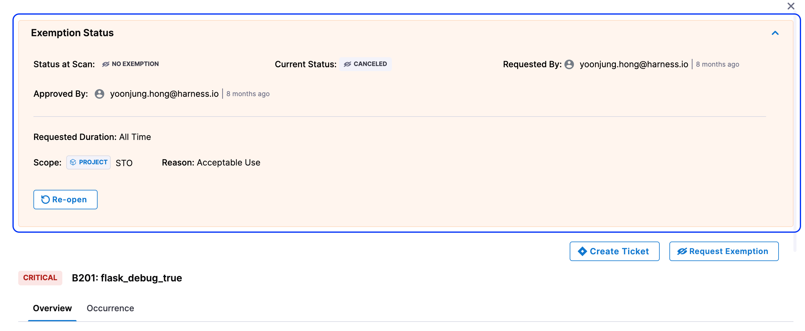 If an exemption applies or was requested for an issue, the Exemption Status at Scan section appears at the top of the pane. Here, you can view exemption details or take actions (Approve, Reject, Re-open) based on your permissions. Learn more in Issue Exemption Workflow.