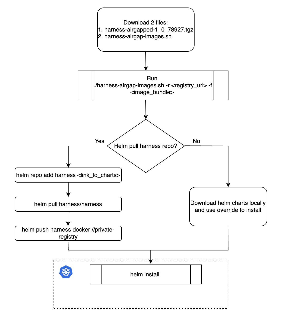 This topic explains how to use Helm to install the Harness Self-Managed Enterprise Edition in an air-gapped environment and how to obtain and transfer Docker images to a private registry with secure access. The steps include pulling Docker images, saving images as .tgz files, uploading to Google Cloud storage, downloading Helm charts, and pushing charts to your private repositories. This process ensures secure and seamless deployment of the Harness Self-Managed Enterprise Edition in restricted, offline environments.