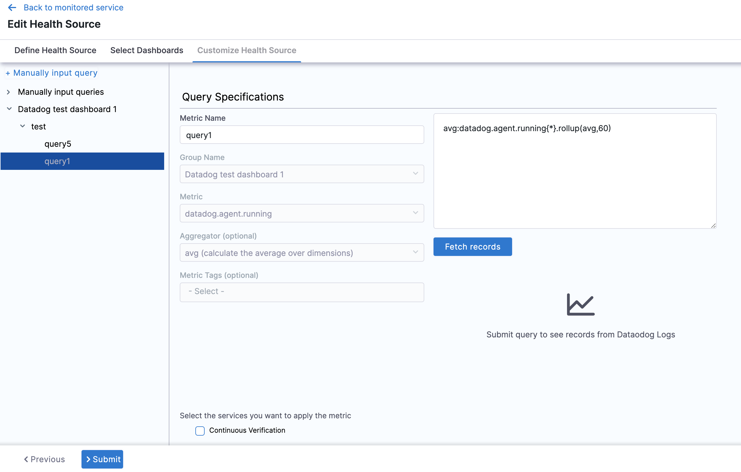 You can customize the metrics to map the Harness Service to the monitored environment in Query Specifications and Mapping settings.