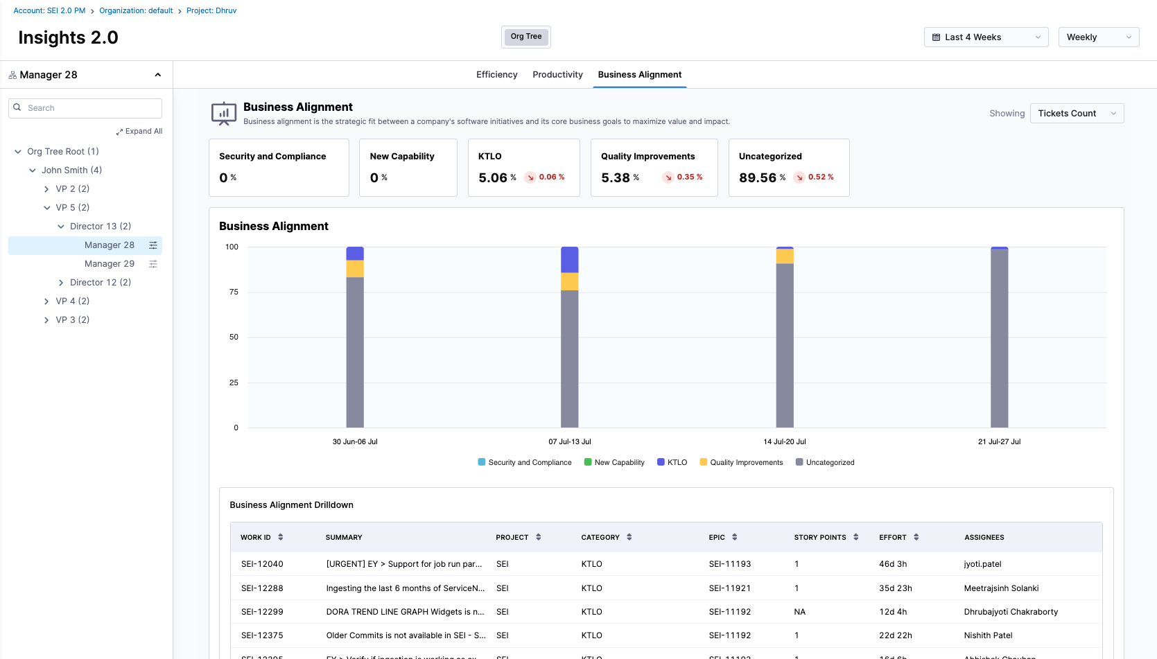 The Business Alignment Report in SEI 2.0 helps you understand how your teams are investing their time across business-relevant categories, such as KTLO, Quality Improvements, and Security & Compliance. Unlike the previous widget, this version uses team-level category definitions instead of global allocation goals, offering greater customization and contextual alignment per team.