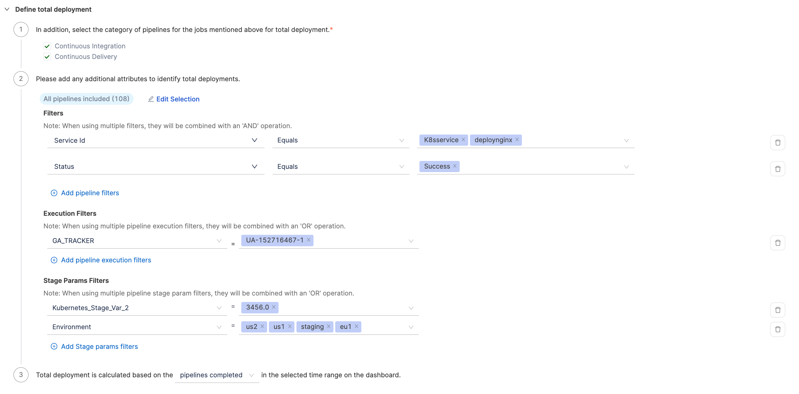 • Defind the settings for how you want to calculate deployment frequency. The additional filters being used to define the deployments will be applicable to all the integrations that you selected.