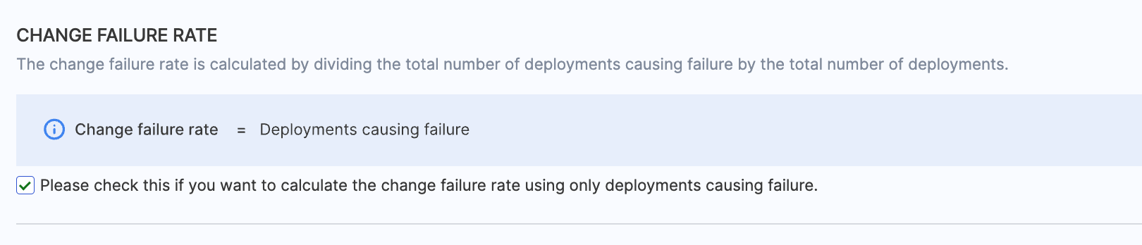 Change Failure Rate is computed by dividing the total number of deployments causing failure by the overall number of deployments.
