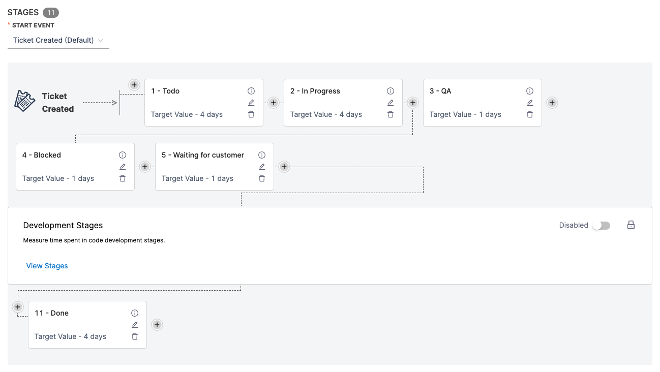 • Default development stages (tracked via your SCM) are by default configured. You can enable or disable these as needed.
