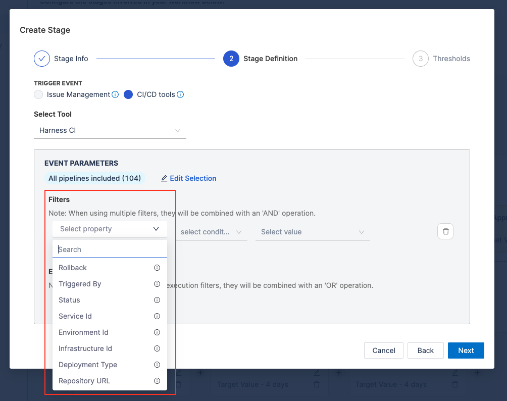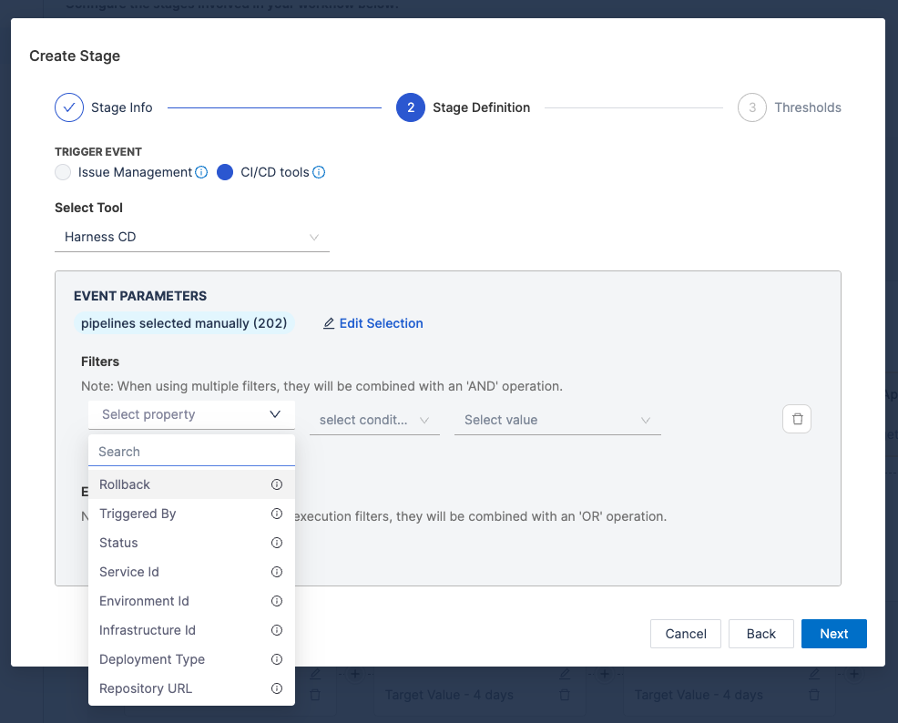 • Refine the calculation by specifying detailed filters. This filters pipelines that should contribute to the change failure rate calculations.