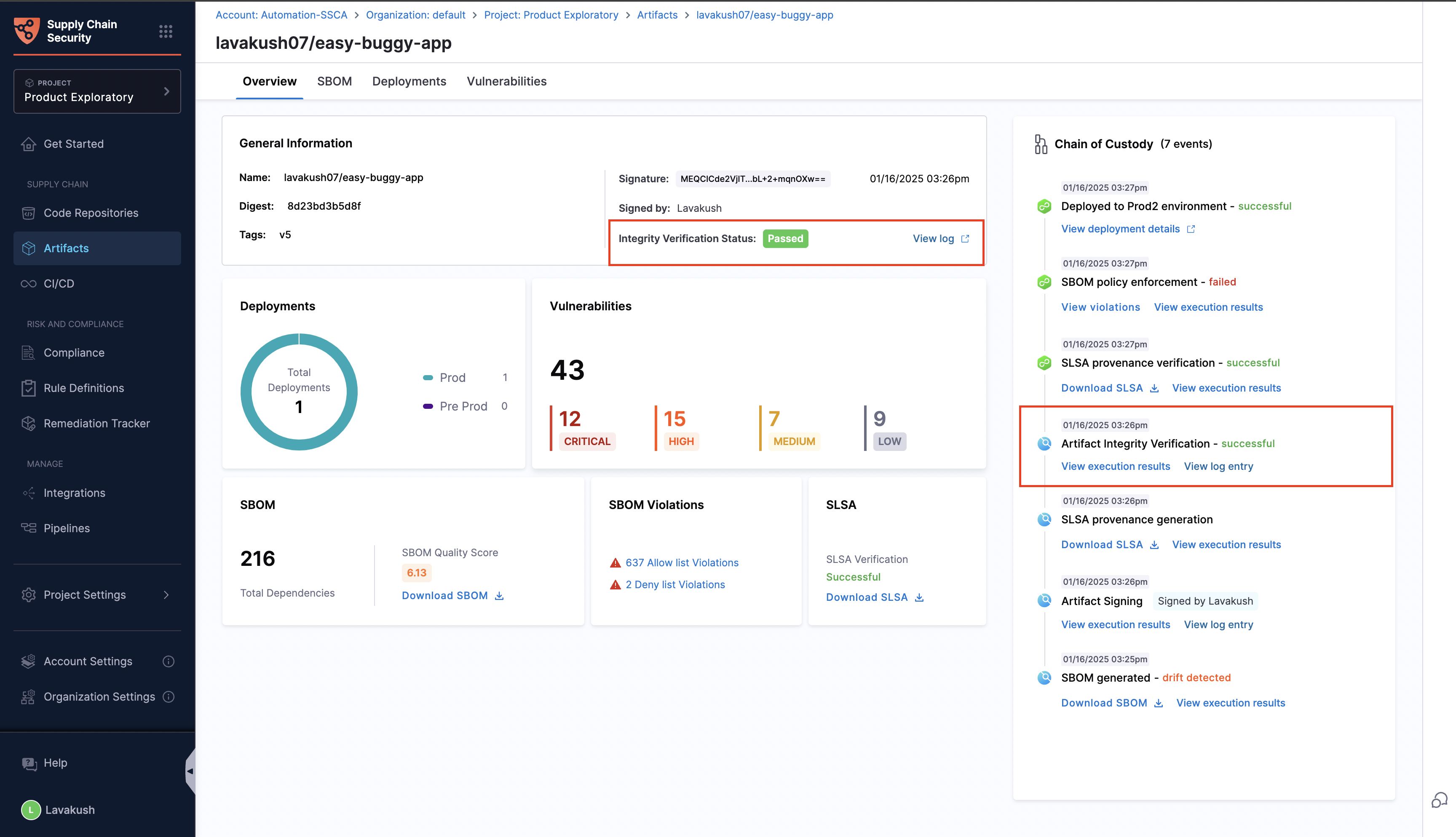 Once the artifact is signed and verified, you will be able to see the Artifact Integrity Verification status from the Artifacts Overview tab.