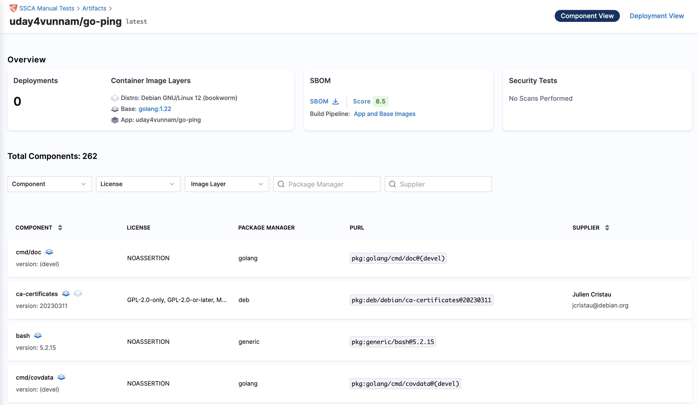 The SBOM orchestration process extends beyond generating the SBOM. It also analyzes the artifact's metadata to determine the origin of each component within the image. These components are then labeled in the artifact view with tags such as app, base, and distro. This clear labeling pinpoints the origin of each component, offering deeper visibility into your software's composition, ultimately empowering you to effectively mitigate security risks.
