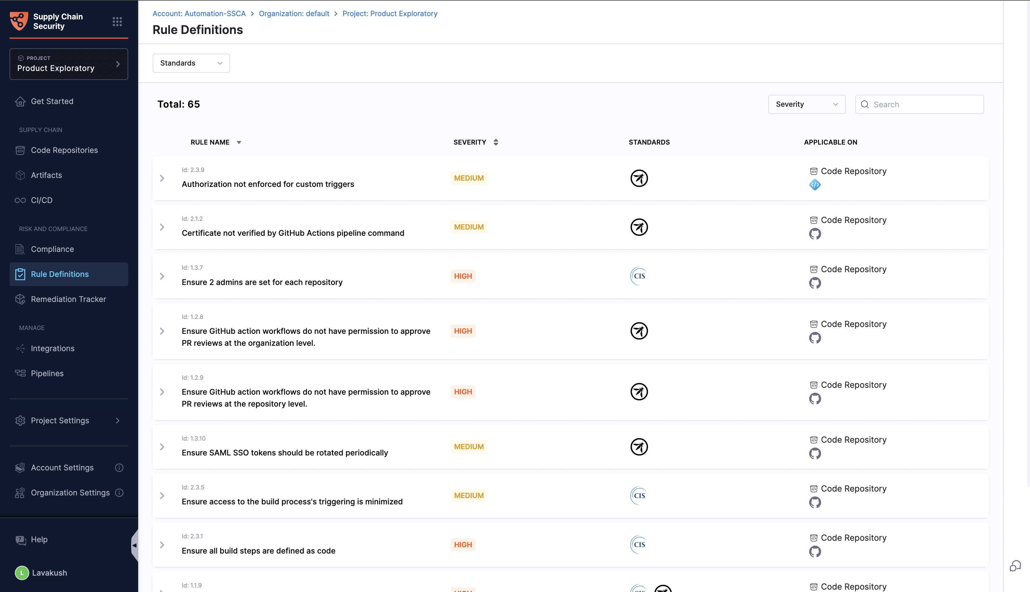 The Rule Definitions section offers a complete list of all the standards and associated rules supported by Harness SCS. These rules are applied to various target types, and the overall compliance posture is presented in the Compliance section of SCS. To learn more about managing the compliance status, refer to the Compliance Summary document.