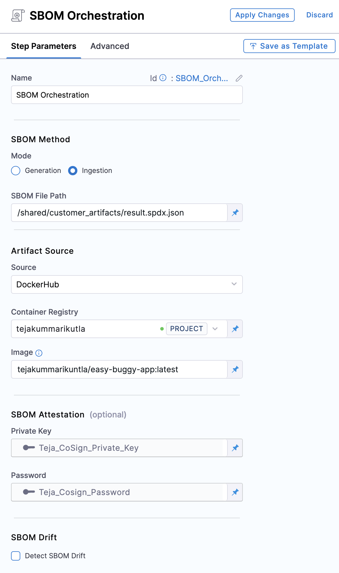 Add an SBOM Orchestration step configured to ingest the SBOM: