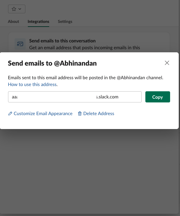 Step 1 : Go to your slack channel and then Integration, select send emails to this conversation