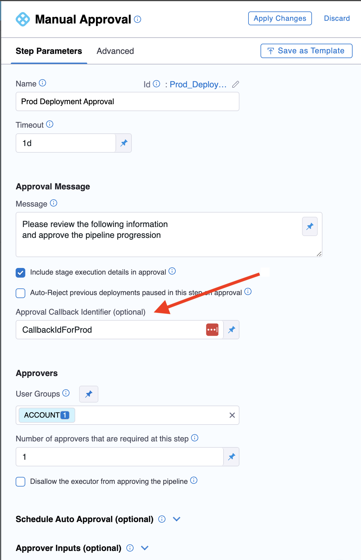 There can be some usecases where multiple approvals are waiting in a pipeline, and we want to approve a specific one out of them using the API. To overcome this limitation, the configuration of Harness Approval Step contains a parameter—callback_id