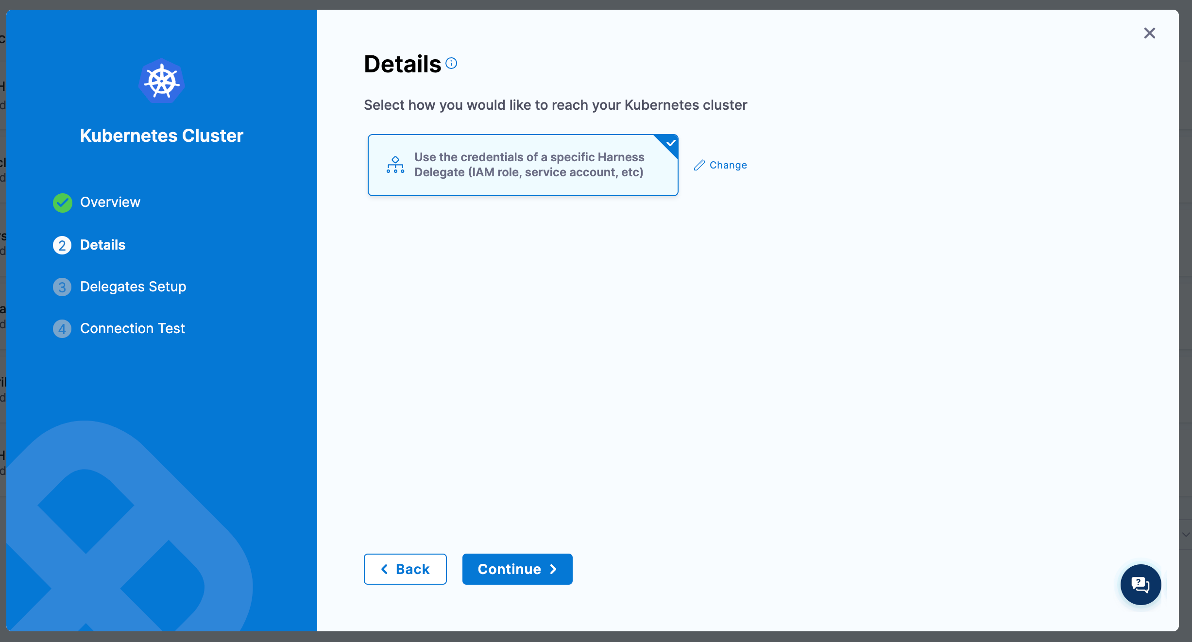 Select Use the credentials of a specific Harness Delegate (IAM role, service account, etc)