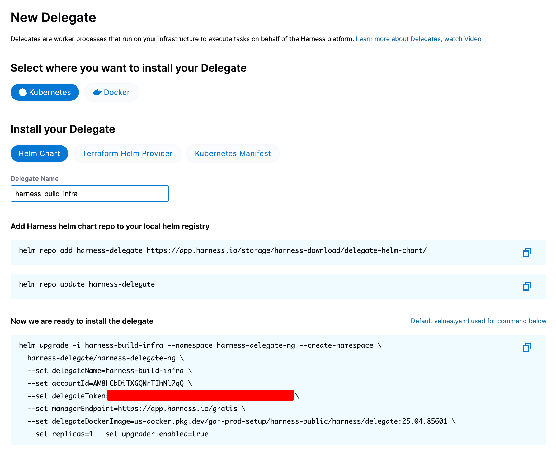 Once authentication is set (and kubectl/helm are installed) we can deploy a delegate.