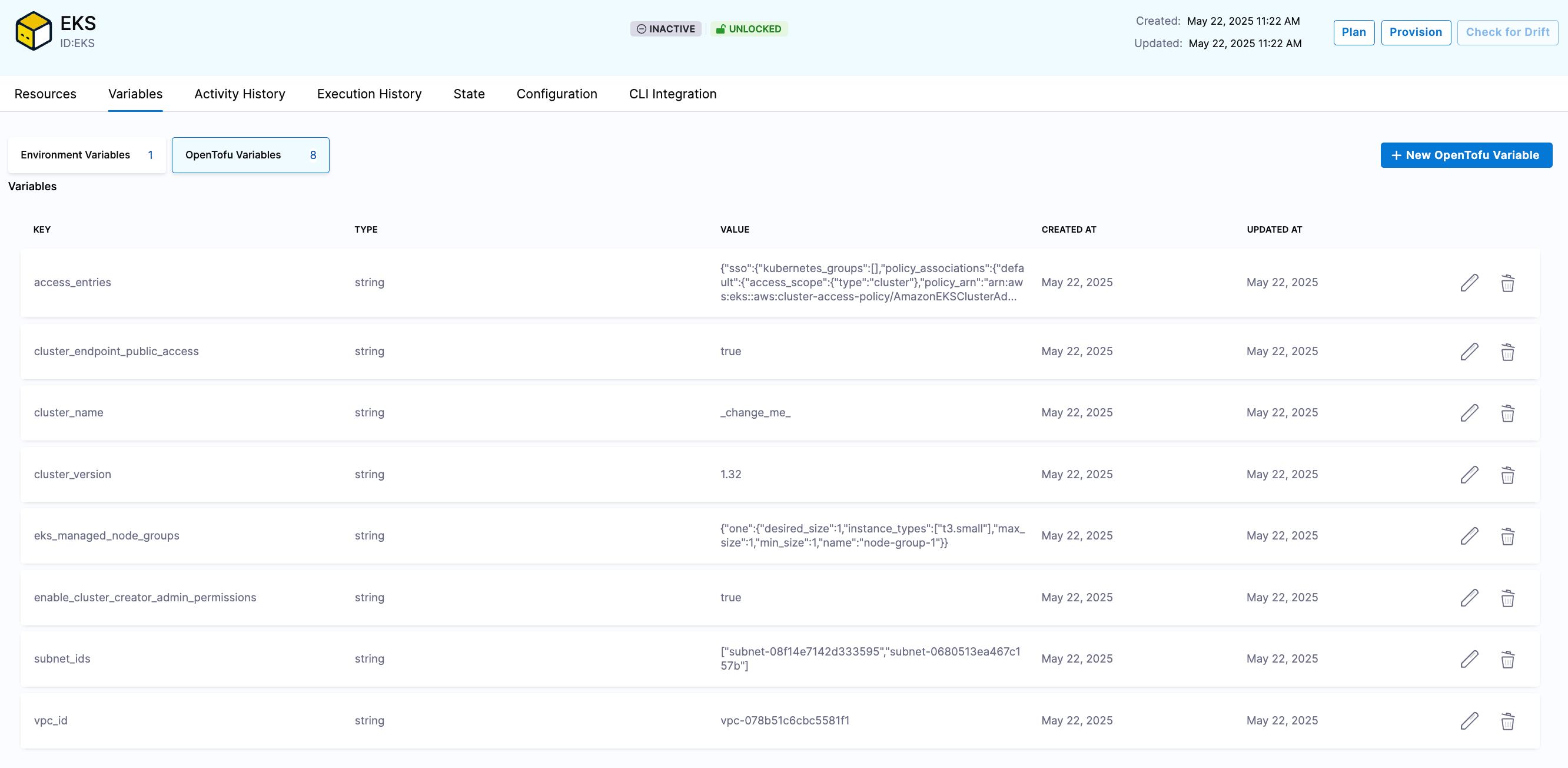 A workspace in IaCM represents the Terraform code you want to provision and a single "state" or instantiation of the code. We will create a workspace that points to the AWS EKS Module source as our code, uses the AWS connector we created for access to provision, and finally some variables to actually customize the EKS cluster being deployed.